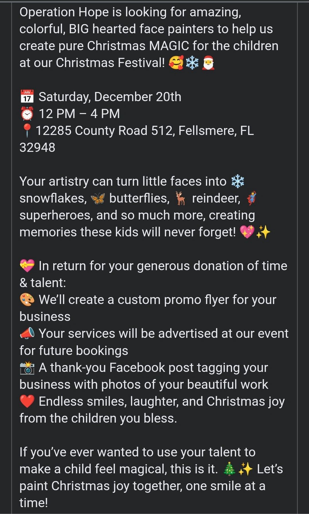 (12285 County Road 512, Fellsmere, FL 32948.) (Operation Hope P.O. Box 1152 Fellsmere, FL 32948)